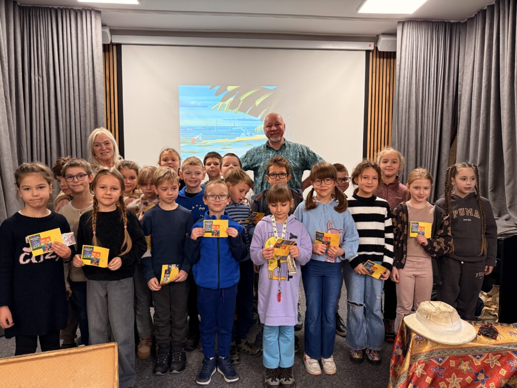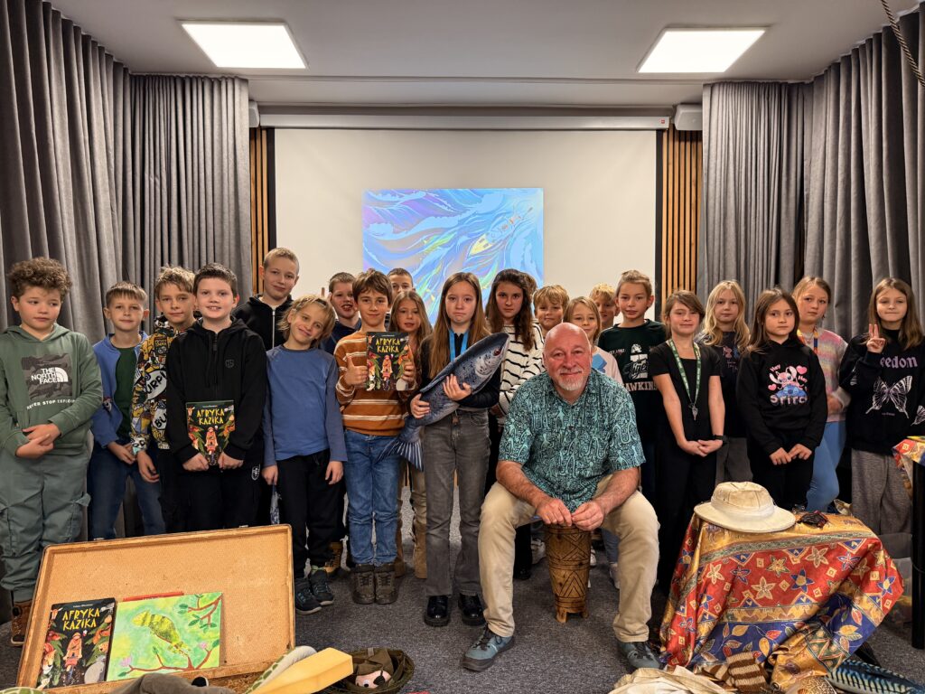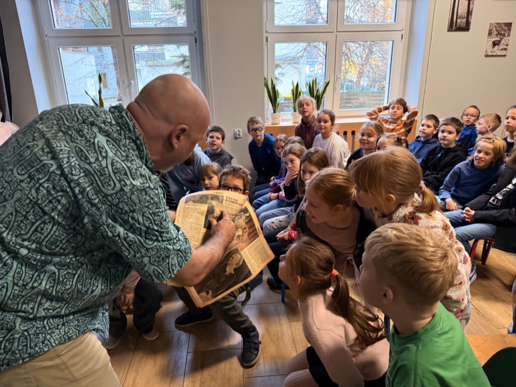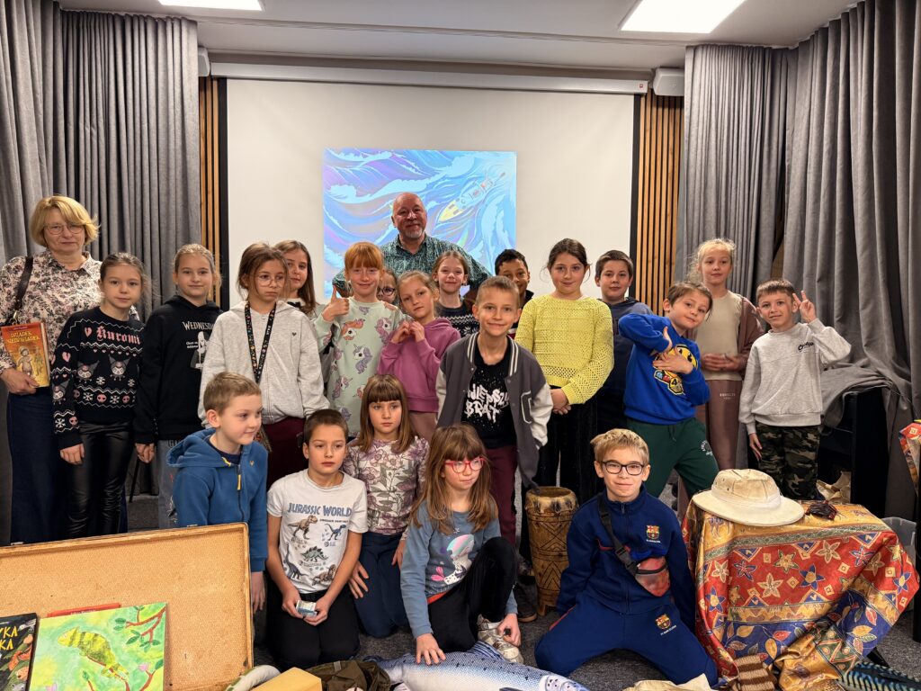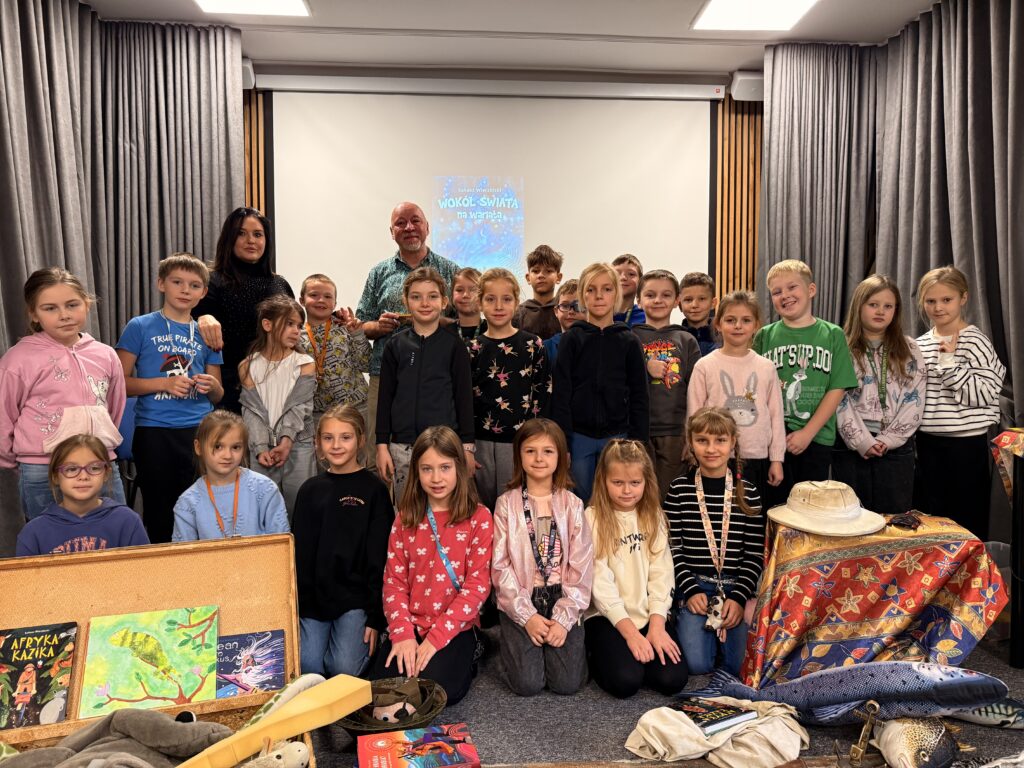 W czwartek 20 listopada 2025 r. uczniowie klas drugich i trzecich uczestniczyli w niezwykle interesującym spotkaniu autorskim. Łukasz Wierzbicki: redaktor, biografista, podróżnik i autor książek dla dzieci z ogromną pasją prezentował swoją literacką twórczość. Jego powieści: „Afryka Kazika”, „Dziadek i niedźwiadek”, „Ocean to pikuś”, „Machiną przez Chiny”, oraz inne cieszą się dużym zainteresowaniem wśród czytelników w Polsce. Niektóre z nich zostały wyróżnione i nagrodzone w konkursach literackich, a także w przeglądach nowości wydawniczych. Podczas spotkania Pan Łukasz Wierzbicki w charyzmatyczny sposób przybliżył uczniom barwne, a czasem niebezpieczne przygody swoich literackich bohaterów. Pisarz nawiązał z dziećmi niezwykłą nić porozumienia się.