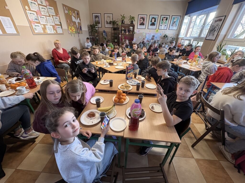 Klasa 4a przygotowała dla naszych gości serdeczne powitanie 🎉 oraz wspólne biesiadowanie 🍪🥪☕ Nie zabrakło też emocji podczas konkursu wiedzy o „Kajku i Kokoszu” 📚🧠, w którym razem zmierzyliśmy swoje siły 💪😄